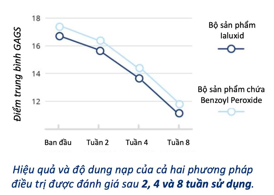 Nghiên cứu lâm sàng đã so sánh hiệu quả của IALUXID (Hydrogel Ialuxid) và một công thức chứa Benzoyl Peroxide.